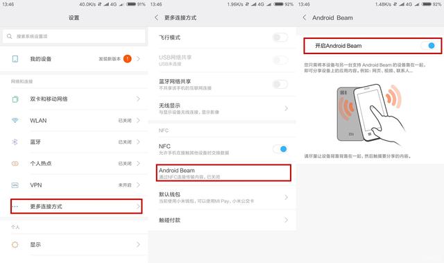 两个拥有NFC功能的手机只要将NFC功能触碰在一起就能够直接相互传送文件、照片,对比与蓝牙功能是更加方便了,因为蓝牙功能传递文件还需要让两个手机进行配对。开启方法:设置--更多连接方式--Android Beam--开启Android Beam。