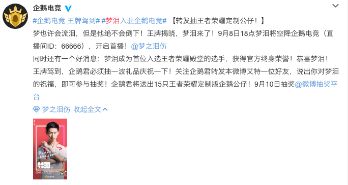那么9月8日18:00,让我们一起锁定企鹅电竞房间:66666,一起期待梦泪直播首秀旗开得胜,你准备好跟我们一起加入企鹅电竞了吗?