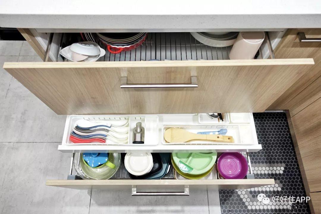 燃气灶下面的空间做了放碗的抽屉,因为空间有限,于是做了高低台面,原本打算做在上层的餐具隔板只能硬塞在两个抽屉中间,虽然使用不是特别方便,但是好歹是多了争取到了储物空间。