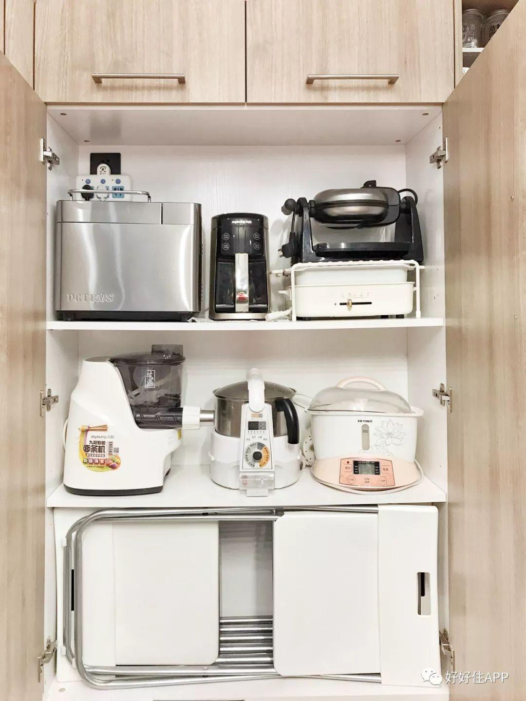 工具柜旁边的电器柜主要放的一些体积较大不怎么方便拿取的小家电,预留了插座,基本上不需要搬进搬出。整个柜子都是可移动的隔板,可自行调整高度,最下面一层刚好放下6张宜家的折叠椅。柜子设计深度350,实际内空300,一般的小家电都能放得下。