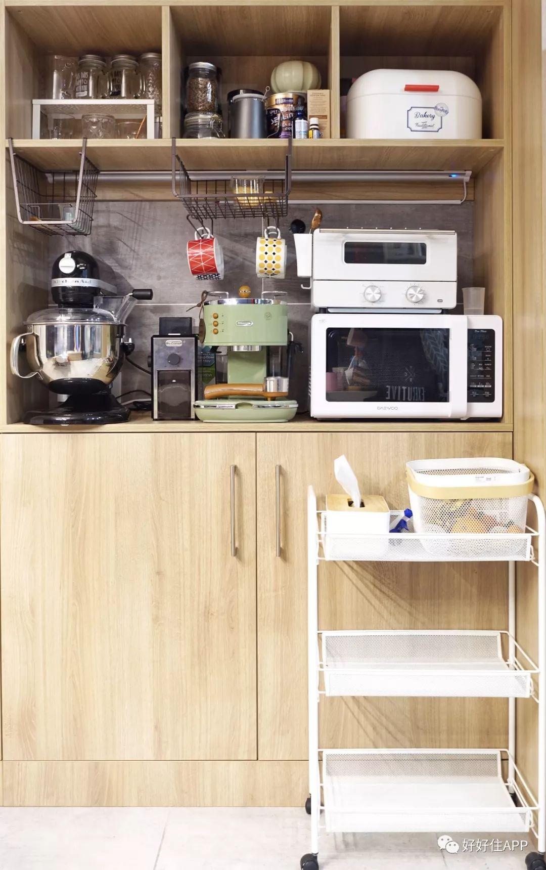 这是跟岛台同长度的餐边柜,长1200,宽350。台面上刚好塞下常用的这几台小家电。为父母购入的大宇新款双层微波炉,使用相当方便。