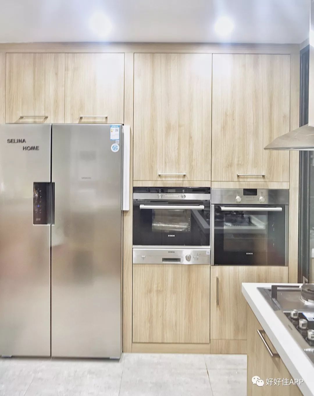 因为地柜有限,水槽旁完全没有放洗碗机的地方,只能把它和蒸烤箱塞在一起。如果有打算把洗碗机放高柜一侧的住友,需要特别提醒的是:洗碗机的踢脚线需要特别定制,一般的都是在地柜一侧,地柜是有地脚的,所以洗碗机的踢脚线是靠里面一点跟面板不在一个平面上。