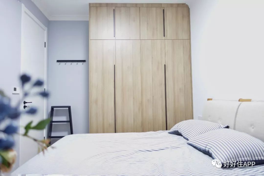 因为从进家门第一眼就能看见这间卧室,所以为了减少存在感,安装了尽量和电视墙融为一体的超高大白门,给床头墙面也继续留白。不喜欢给墙头挂画,暂时也没更好的idea,暂且都留白吧。