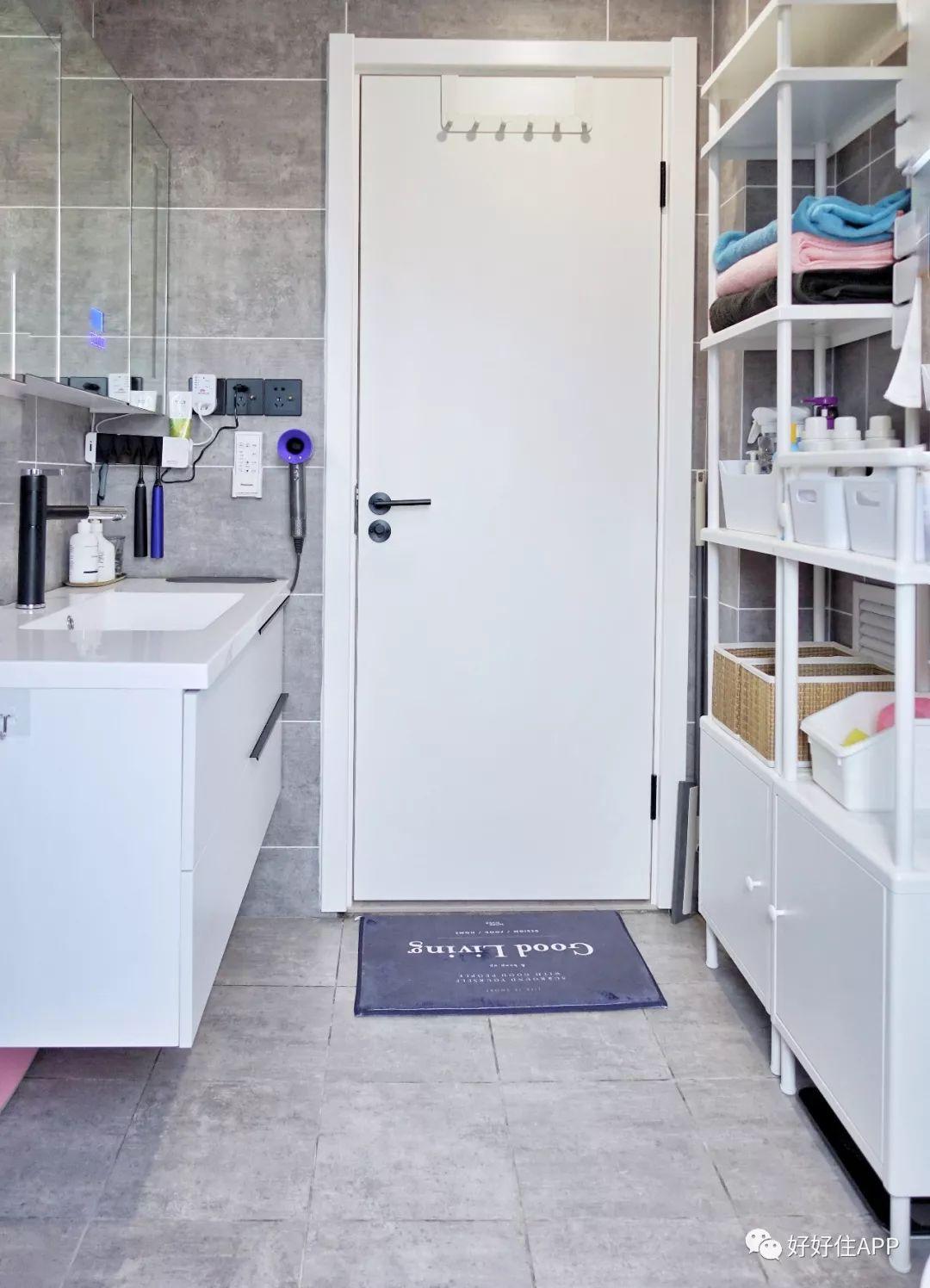 主卫生间的门后有落水管,斟酌到后期检修等各种问题,不能使用固定的柜子,但又不想浪费掉,刚好宜家有很多这种利用边角尴尬位置收纳柜,新的迪南系列特别合适,高矮能够根据自家的需求随意组合,专门预留了电热毛巾架位置,也是刚刚好。