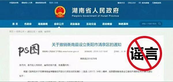 近日,一张ps迹象明显且冒名湖南省人民政府官方网站发布的“关于撤销衡南县设立衡阳市清泉区的通知(湘政函【2018】78号)”的网页截图在微信朋友圈传播,引发网友讨论。