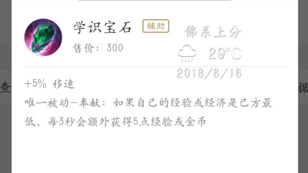 这是一件辅助装备,就这样一看,没有什么起眼的地方。让我们对比着来说。首先移速,在目前装备中,除了鞋子、辅助装备之外,拥有移速加成属性(被动不计)的装备:
