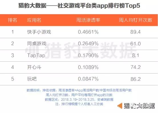猎豹大数据3月份公布的排行榜则显示,依托快手app,快手小游戏的数据迅速增长,成为3月同类app中平均打开次数、渗透率最高的。