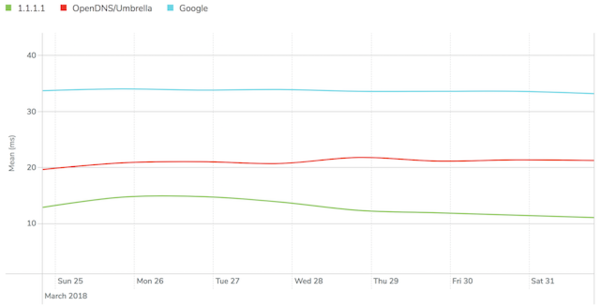 Cloudflare的DNS将支持DNS-over-TLS和DNS-over-HTTPS,全球平均响应时间为14ms,而OpenDNS为20ms,Google DNS为34ms,相比之下能够说是相当的快了。