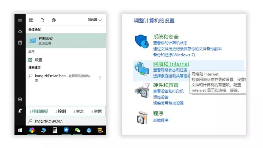 设置方法很简单,以Windows10为例,先通过菜单打开[控制面板](打开开始菜单直接搜索即可),然后打开其中的[网络和Internet]项目;
