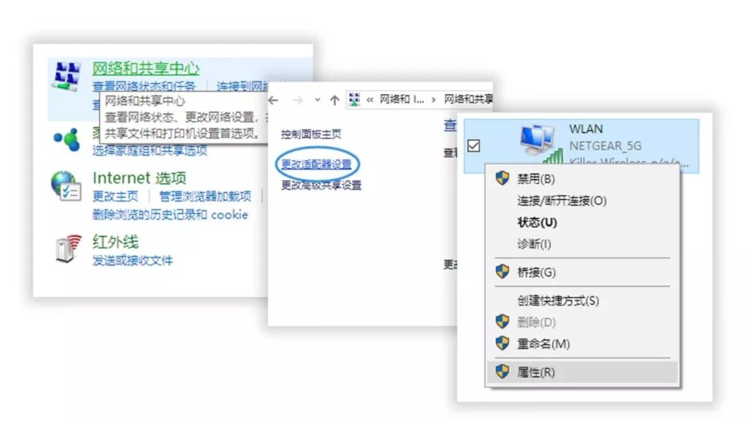 然后在其中的[网络和共享中心]中点开左上角的[改变适配器设置],“右键点击”你所用的网络图标,打开[属性];