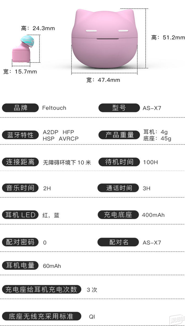 AS 不倒翁真无线音乐耳机的外形是超萌的不倒喵造型,既是耳机的充电舱和收纳盒,又是一个摆件和玩具。无论走到哪儿都能够带上它。它就是你掌心里的萌宠,给你的生活带来无线的快乐。 耳机采用45度角贴合耳廓设计,舒适佩戴,无感随心,享受音乐更自在。超小迷你: 专业调音,高音方面清靓,穿透力强。中音方面浑厚、圆润、耐听。低音方面下沉、强劲。把音量开到最大,也没有出现破音、失真。定位准确。还原音乐细节,音色层次分明。远距离连接,大于10米稳定连接,即使隔着墙信号也不会中断。初次链接手动配对,二次使用自动链接终端设备,去除了使用上的麻烦。化繁为简,离开充电仓自动开机,放入充电仓自动关机,开始充电。
