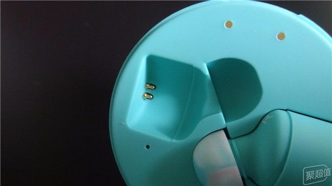 取出耳机在充电舱下面一半的耳机凹槽里有两个弹性触头,是为耳机充电的。在放置耳机为耳机充电时一定要注意耳机的充电金属触点一定要和凹槽的触头接触好,千万别装反了。