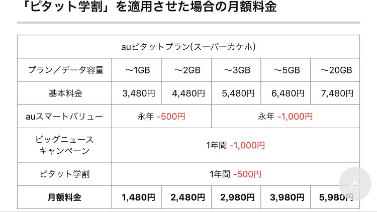 比如au的ピッタト套餐的学生优惠,学割每个月500日元,一直都有效。以及这个套餐自带的ビッグニュースキャンペーン有1000日元的优惠,加起来就是每月优惠有1500日元。第三行的スマートバリュー属于家族优惠,留学生用不了。