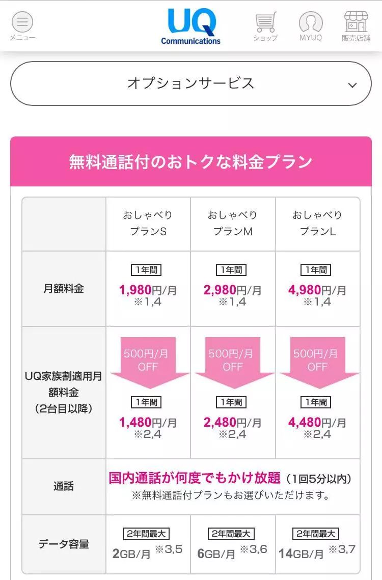 比如上图UQ最便宜的套餐价格,一个月1980日元,2GB流量,通话5分钟内免费。y!mobile基本上和这家差不多。