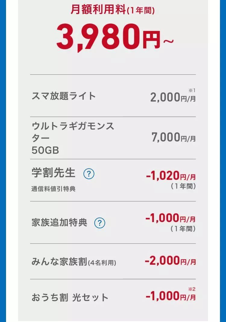 剩下的家族成员特典1000日元奖励,以及家族成员优惠2000日元,对于留学生来说都扣除不了。以及最后的光セット(无线)1000日元,如果不在他家办网,连这1000日元都省不了。每个月得交7980日元的花费。所以不要选这个官网主推的套餐,利用学割选个经济实惠的就行。