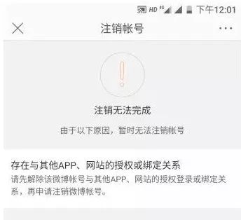 与微信类似,微博注销同样遇到因为其和其他App、网站存在绑定和授权登陆的关系,导致无法注销。不过,新浪微博并没有给出究竟微博授权了哪些平台,所以就需要用户自己回忆。