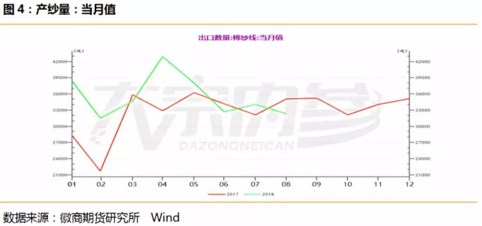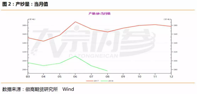 Wind纱产量数据显示,国内8月纱产量为277万吨,较7月份的288万吨有所减少。期货市场上,9月25日,郑商所棉纱期货下跌,郑纱1810合约收于25435元/吨,跌390元/吨。市场对纺织行情表示担忧,本该是金九银十的旺季来临,市场却呈现旺季不旺的特点。