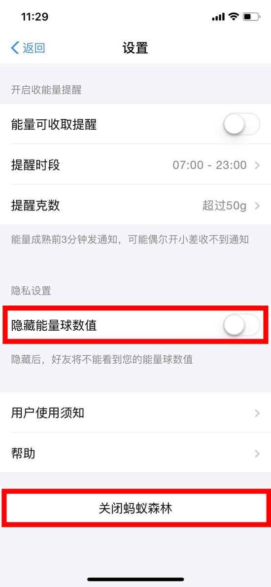 有用户肯定会问?有什么办法能避免这些呢?答案也很简单,我们只需在设置中打开“隐藏能球量数值”即可。如果仍然担心自己信息泄露的话,能够点击关闭蚂蚁森林即可,关闭后可根据需要重新开通使用。