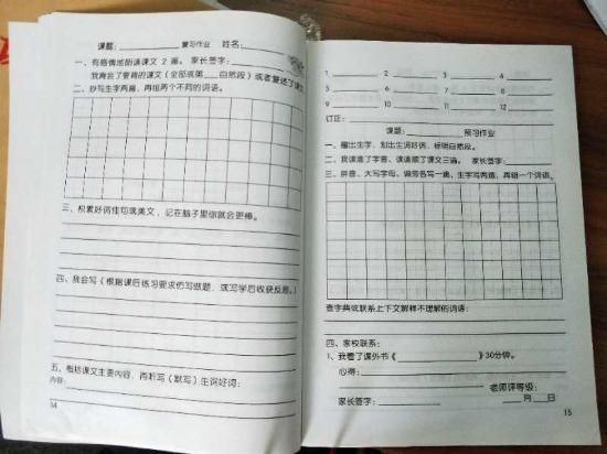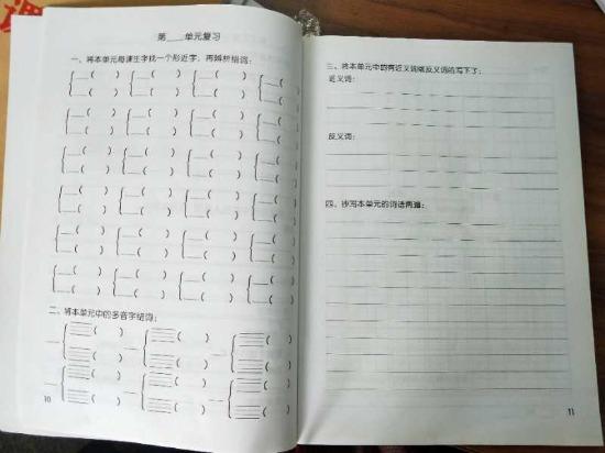 记者看到,该家庭作业本根据学生正在使用的鄂教版语文教材设计,有听、说、读、写四方面内容,而且机械抄写内容不多。除此之外,设置了听写词语的位置,和抄写词语分开,安排在不同的两面完成,抄两遍,听写一遍,作业位置全部固定下来。