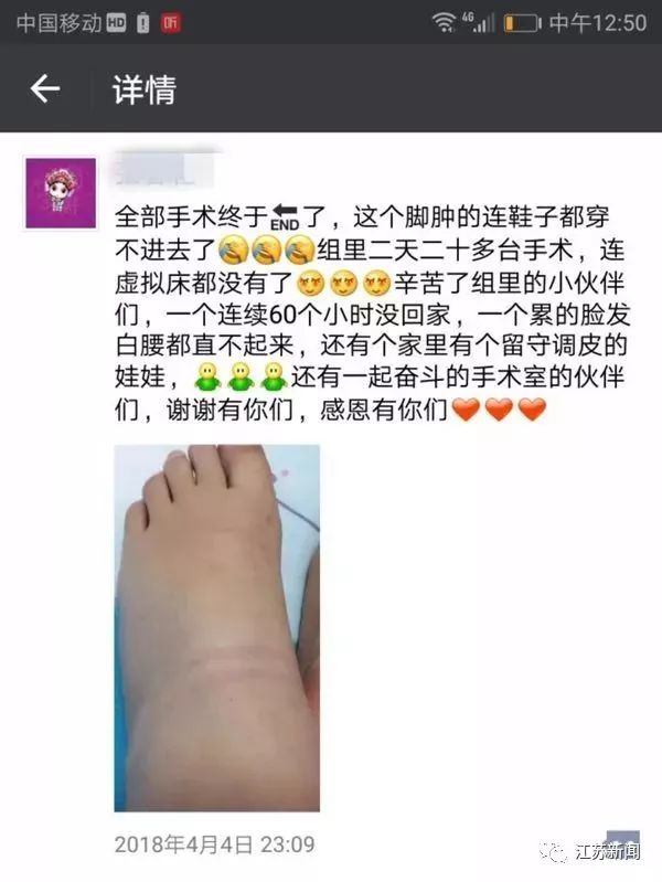 “ 清明小长假前出现了一个手术高峰,那两天我们组里一共四个医生连轴转,基本上每天都得忙到晚上十点多,一天下来要站十几个小时”,张春花告诉记者,4月3日那天,做了13个小时的手术后,她的脚肿了起来。“做手术的时候我们基本上是站在那里保持一个姿势不动的,大的手术要三个小时以上,小手术也差不多一个小时,一天站下来脚肿是常有的事”,第二天一早,虽然经过了休息,但是脚部肿胀的状况并没有太多缓解,等着她的还有十多台手术,其中还有复杂的恶性肿瘤手术,这意味着她又得站十几个小时。