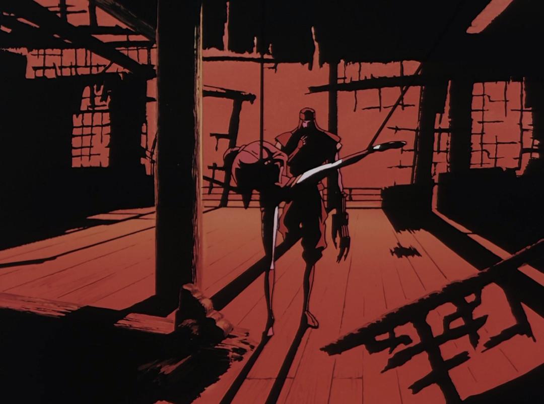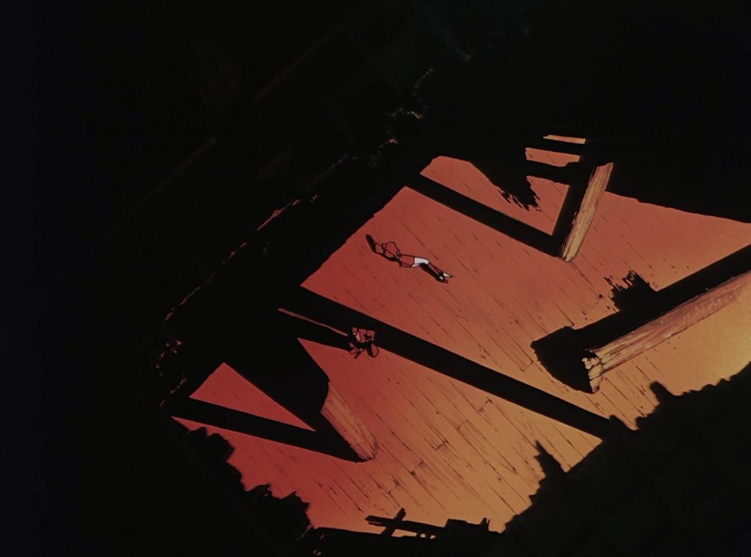 从影片第一小时整(片中时间大约是黄昏)开始,笔者心目中这部电影的美学巅峰便来临了——兽兵卫为解救阳炎,与操纵影子的反派忍者作战。这一段战斗全部使用红黑色调,光影和构图无一帧不优美绝伦。斜阳鲜血淋漓般的凄厉哀艳感、刀刃架在脖颈后一般令人毛发倒竖的锋锐危险感、安定的空间与静默的空气共同构成的紧绷张力,几乎溢出屏幕。