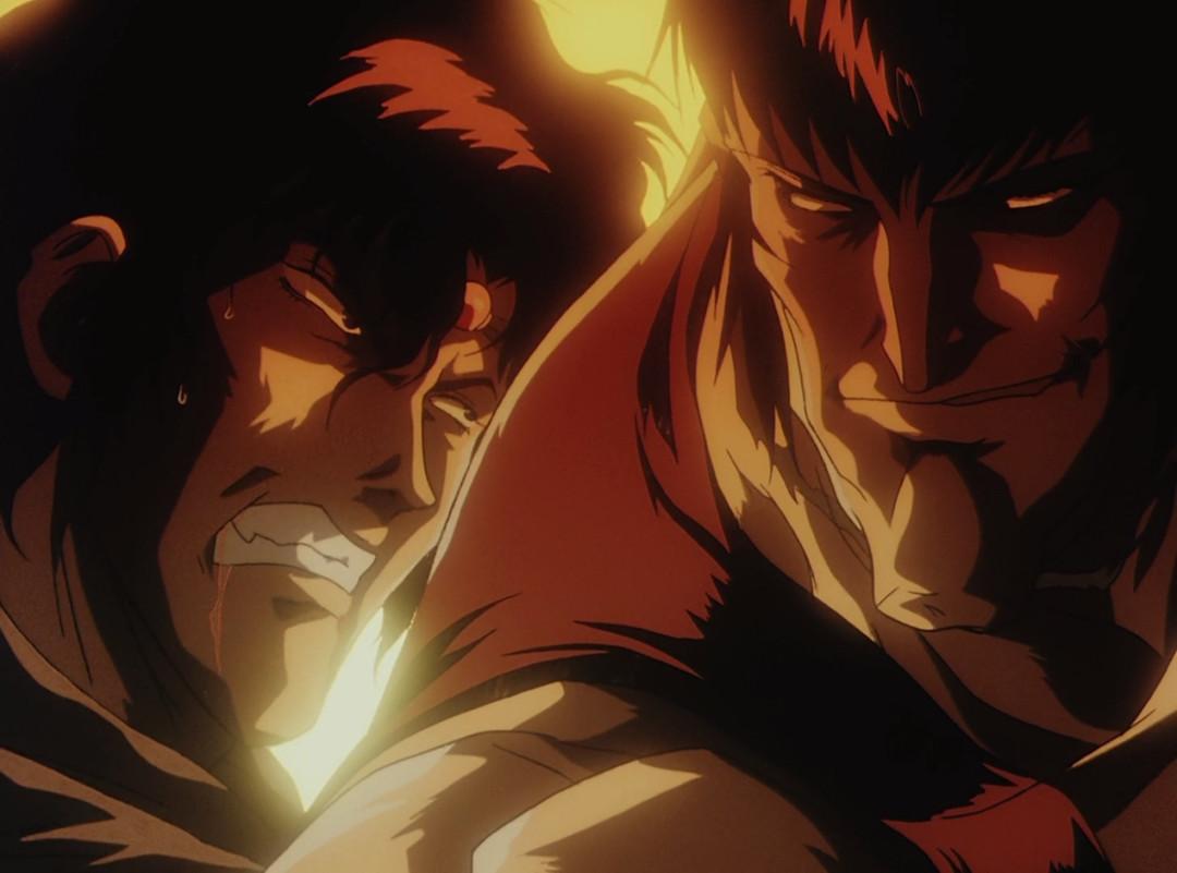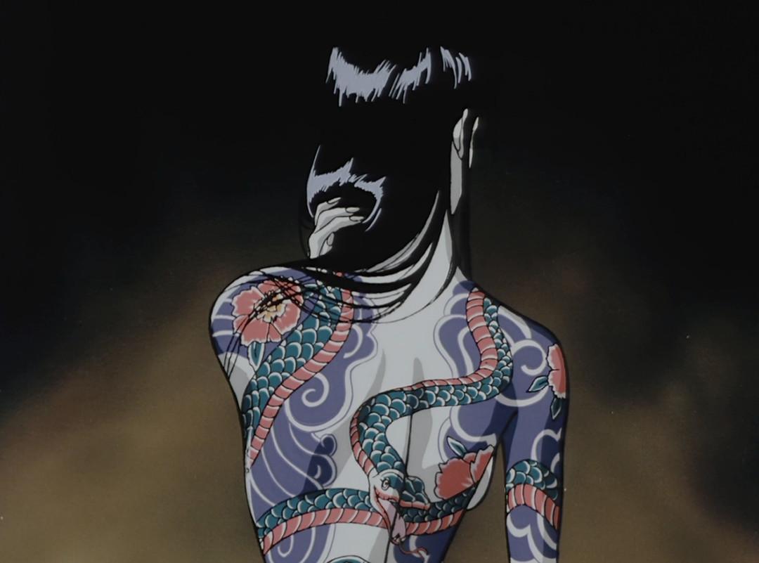 之后甲贺组长半佐被铁斋撕扯成几段,阳炎被抓,随即进入预想中的(误)*暴强**戏份和兽兵卫登场后的英雄救美戏份。上世纪的OVA对性的表现大多并不避讳,并且会加以精心刻画——铁斋吮吸阳炎身体的部分大多采用一拍二,时间点抓得精妙,动作的韵律感很强,赏心悦目。这一段也使用了川尻喜欢的高对比浓重BL影(纯黑影)加蓝色调暗面。阳炎的肌肤也笼罩一层暗蓝色,兽兵卫出场时半个人都全部笼罩在黑暗中——这种高对比度阴影,是川尻风格中被人们指出颇有美式漫画感的部分之一。而随后登场的手拈朝颜花的美少年百合丸、点点萤火中的阳炎,这样之类的自然景物与人情相融合的纤细描写,又是弥漫着和式“*美耽**”感的,是监督审美积淀的(有意识或无意识的)流露。