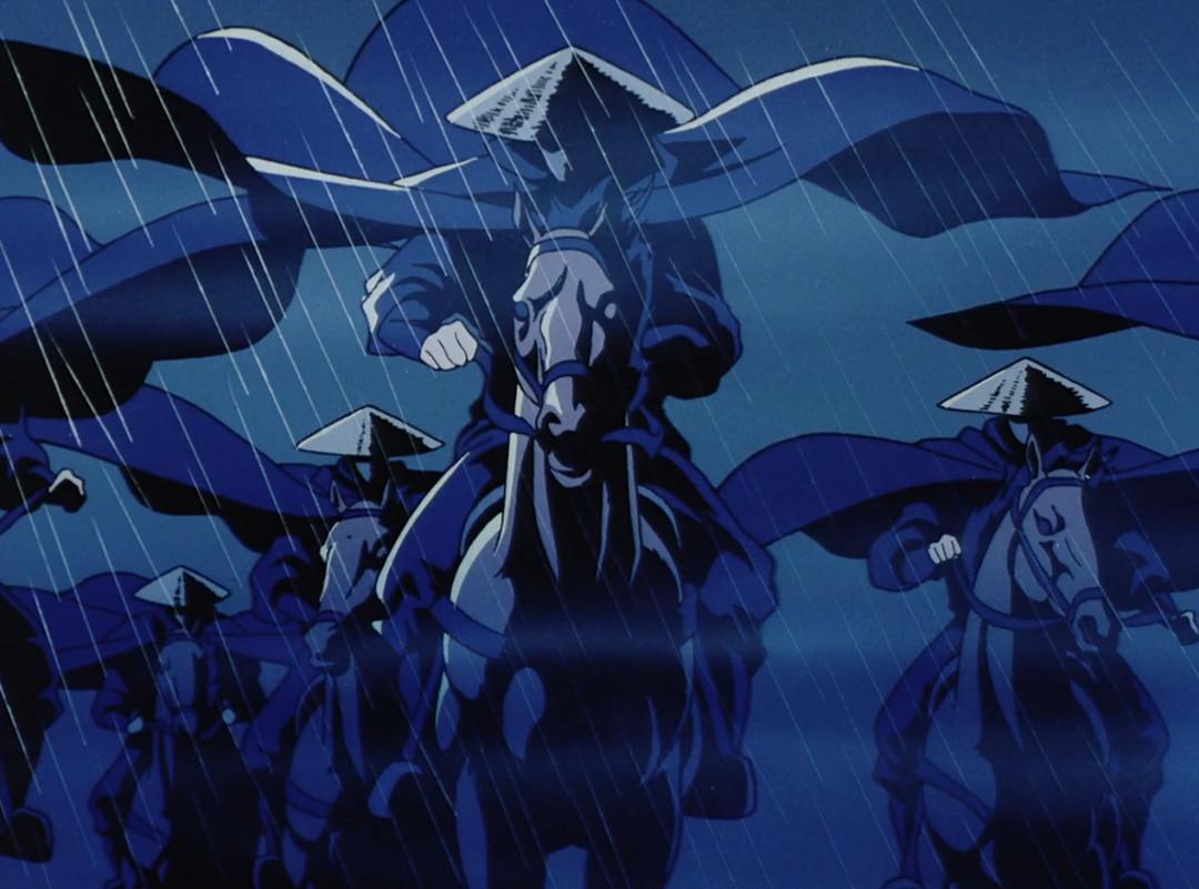 开头的短小战斗便具有教科书般精炼的设计——兽兵卫将手中的饭团抛起,在落下之前将所有敌人一一击倒——这段情节不能不使人联想到胜新太郎的《座头市》,以及《三国演义》中经典的关羽温酒斩华雄剧情。如何表现兽兵卫的“快”?用一个饭团落下的时间,用惊飞的水鸟,用一套フルコマ(full koma)的拔刀动作,并且其中五帧是对刀光而非刀本身的刻画,以此使你感到他拔刀的动作之快以至于肉眼无法看到刀自身的轨迹(还能节约成本…)。当然其他的战斗动作大多还是二コマ打ち(一拍二),但在最需要流丽速度感的地方使用了フルコマ——除了刚才说的兽兵卫拔刀,还有敌人从衣装里裸体跳出来的部分等等。这段战役虽短,却充溢着感官刺激和丰富想象力,譬如从掌心射出爆弹、譬如从衣服里跳出来之后,貌似高大的敌人其实只是用机械装置伪造出的一副高大身躯——这类非现实的忍术战斗,这些足以调动起观众对后续内容与忍者世界观的兴趣,以及,用川尻的话说,足以使“热度”(ボルテージ)迅速攀升。