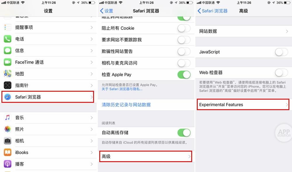 进入「设置」,往下拉到「Safari 浏览器」一栏。进入拉到最下,点击「高级」,再点击最下一栏的「Experimental Features」。