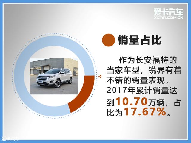 作为长安福特的当家车型,锐界有着不错的销量表现,2017年累计销量达到10.70万辆,占长安福特份额为17.67%。自锐界国产化以来,凭借出众的设计和充足的空间赢得不少消费者的青睐,加之国产化的身份和5座版、7座版车型的多重选择,奠定了一定基础的汽车市场。尽管今年的成绩有所起伏,但是凭借出色的产品力,车辆的销量能够保持平稳。未来,锐界需要进一步加强自身性价比,以获得更多消费者的关注。