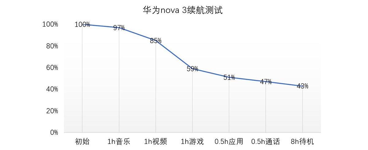 按照小安以往对续航的评测习惯,将分多个项目去测试nova 3在各个场景时的耗电量。测试条件:亮度50%、音量50%、单卡4G、蓝牙关、定位关、WiFi连接、无省电模式、只保存微信、QQ两个后台
