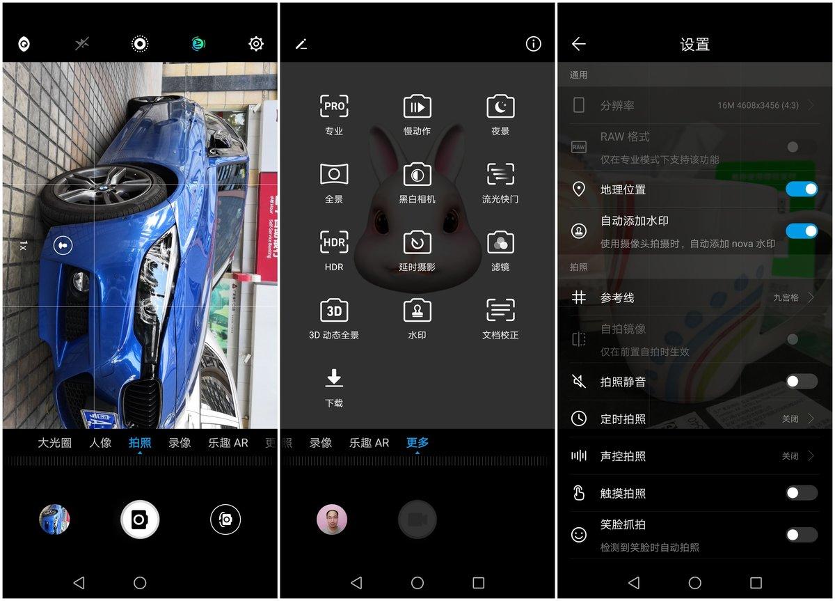 除了软件算法进行升级外,华为nova 3一改之前的相机界面。将原先需要通过左右滑动而展开的所有功能,都集中体现在取景框的上部和下部。另外通过底部就能够切换所有拍摄模式,且将拍摄模式选项放在更相邻的位置。