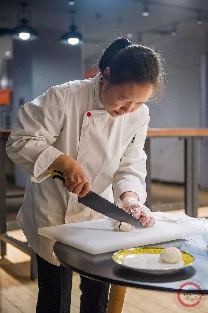 一坐一忘丽江主题餐厅行政总厨石军峰在制作红豆沙乳扇卷,《中国烹饪》官方直播主播熊小饭在同步网络直播