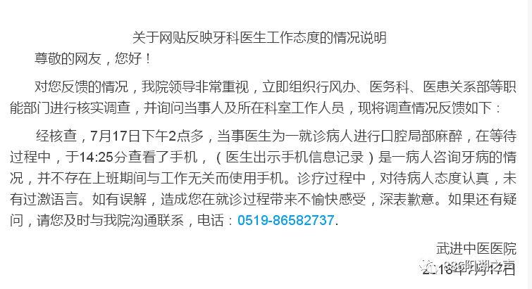 经过核查,当事医生正在为就诊病人进行口腔局部麻醉,等待过程中,于14:25分查看了手机,是一名病人咨询牙病的情况,而且手机信息记录能够证明。