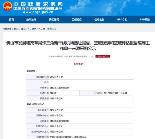 2017年12月4日,佛山发展和改革局发出《珠三角新干线机场选址报告,空域规划和空域报告编制工作单》招标采购通告,最终由中国民航机场建设集团公司及北京华安天诚科技有限公司告捷中标,标志着珠三角新干线机场的开建工作进入实质性阶段。