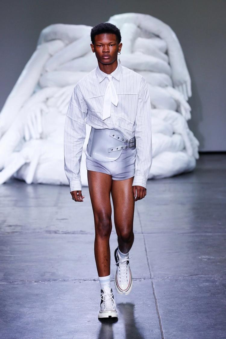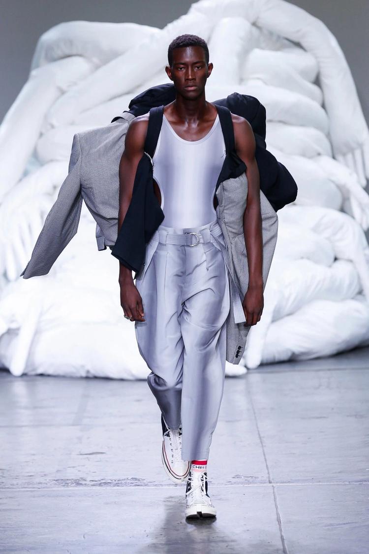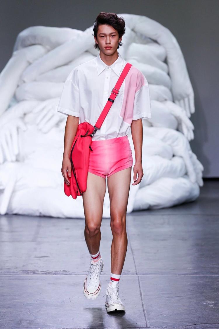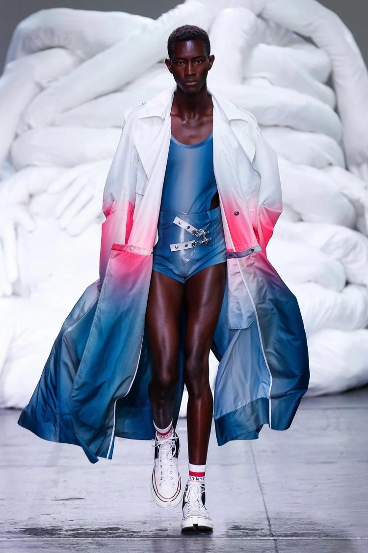 Feng Chen Wang 2019 春夏系列:新系列的要害词是“Half"。设计师在接受 BoF 采访时表示,Half “既有另一半的字面含义,也有对于生活与工作取舍的思考。渐变色与 PVC 材质制作的身体绑带是本季亮点。