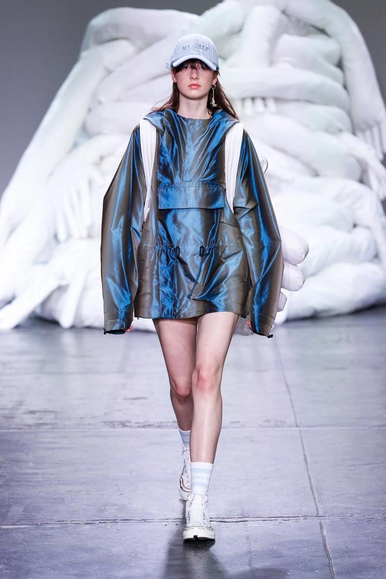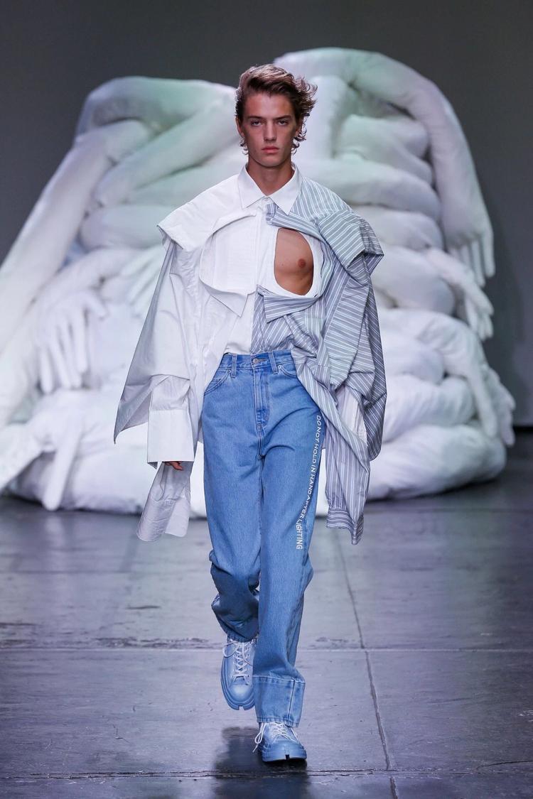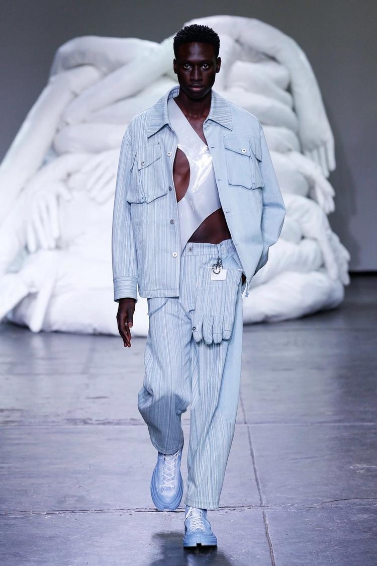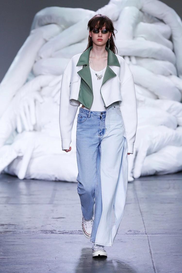 Feng Chen Wang 2019 春夏系列:新系列的要害词是“Half"。设计师在接受 BoF 采访时表示,Half “既有另一半的字面含义,也有对于生活与工作取舍的思考。渐变色与 PVC 材质制作的身体绑带是本季亮点。