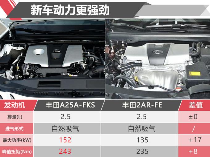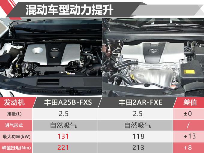 全新一代ES基于TNGA架构打造,提供三种动力选择,ES 200搭载2.0L发动机,ES 260搭载2.5L发动机,ES 300h搭载由2.5L发动机和电动机构成的混动系统,综合功率达到160kW,每百公里综合油耗为4.7L。传动方面,ES 200、ES 260以及ES 300h预计分别匹配6速自动、8速自动、E-CVT无级变速箱。