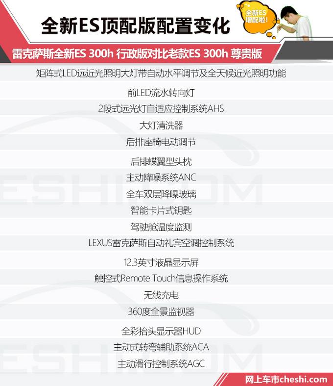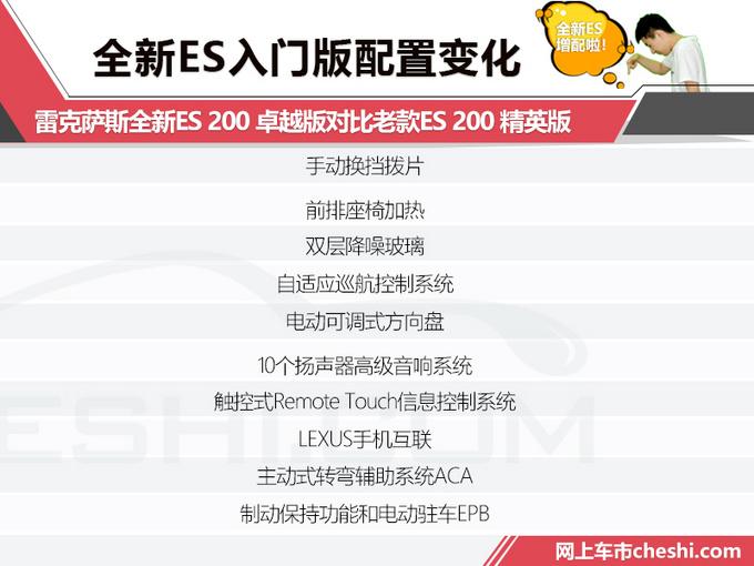 具体配置上来看,全新ES 200卓越版与全新ES 300h 行政版均针对配置进行了升级。全新ES 200卓越版相比老款ES 200精英版,增加了更具运动感和豪华感的新元素在其中,例如手动换挡拨片、前排座椅加热、双层降噪玻璃,并采用了触控式Remote Touch信息控制系统,集成LEXUS手机互联,令整车的科技感得到进一步提升。此外,新加入主动式转弯辅助系统ACA及制动保持功能,更方便驾驶员日常操作。