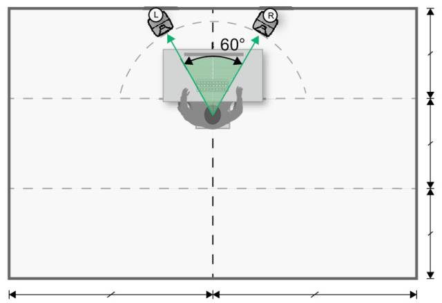 若以音乐制作为用途,请将音箱摆放到前区。将两只监听音箱呈 60 度夹角摆放,并指向听音位置。若以影视制作为用途,请将音箱摆放到后区。