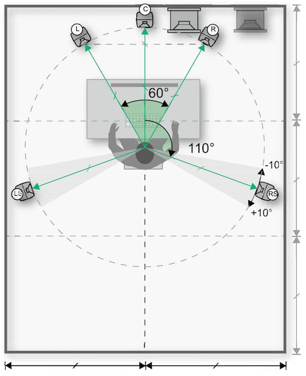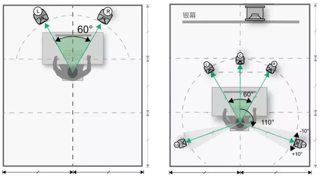 两种不同房间布局中的 5.1 声道监听系统 摆放建议: