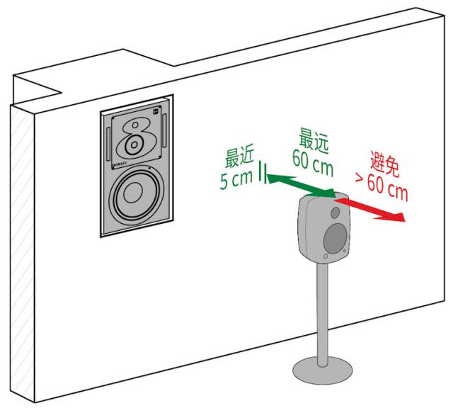 理想情况下,自由摆放的监听音箱应该具有平直的频响曲线,如果靠近墙壁摆放,低频会被增强。靠近一面墙,低频增加 6 dB;靠近两面墙的夹角(或墙和桌子的夹角),低频增强 12 dB;靠近两面墙同地板(或桌面、天花板)形成的夹角,低频增加 18 dB。