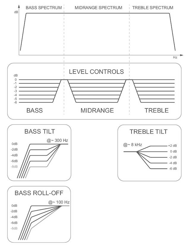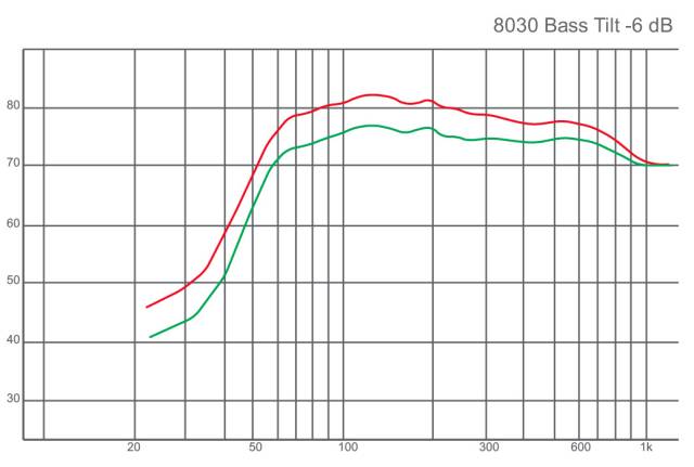 下图是一个音箱靠墙摆放引起低频增多的例子,通过开启低频搁架衰减(Bass Tilt)开关,能够衰减过多的低频,得到较为平直的频率响应。