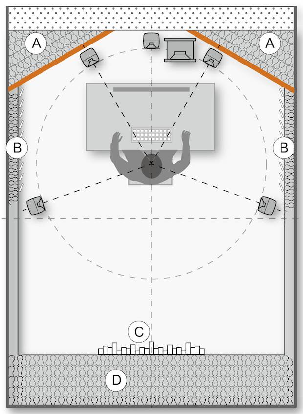 B 组合使用吸声与扩散材料处理侧墙表面。请注意,薄的多孔板只能吸收高频。