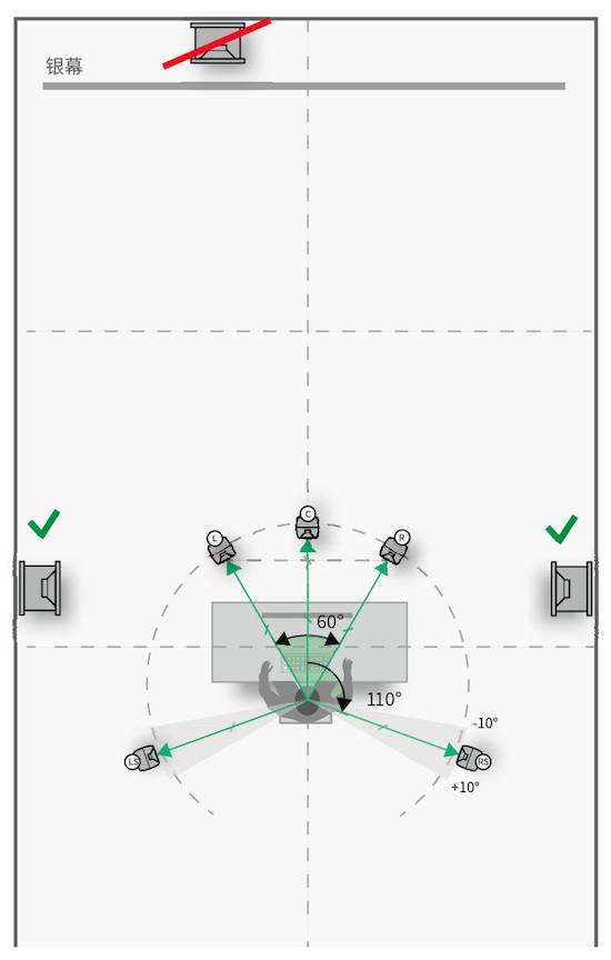 摆放音箱时,应避免墙面、天花板或者地面的反射声到达听音区域,对直达声造成干扰。