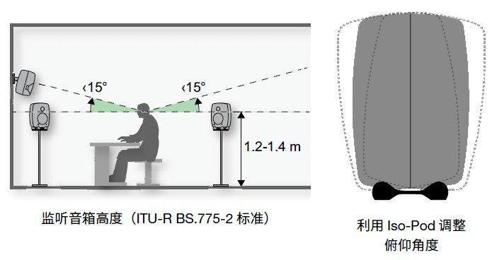 对于典型的二分频监听音箱,音箱声轴高度应与耳朵平齐,通常距地面 1.2 至 1.4 米。将音箱置于更高的位置,并稍向下倾斜,能够减少地面反射的影响。对于标准的立体声和多声道重放,请勿将音箱置于过高的位置上,声轴俯角应小于 15°。音箱需要始终指向听音点。音箱设置的越高,地板反射对于频率响应的影响越小。但需要注意,天花板也会造成低频反射,请勿将音箱置于超过层高一半的高度。