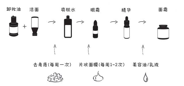 卸妆→洁面→化妆水(爽肤水)→面膜→眼霜→精华→乳液/面霜
