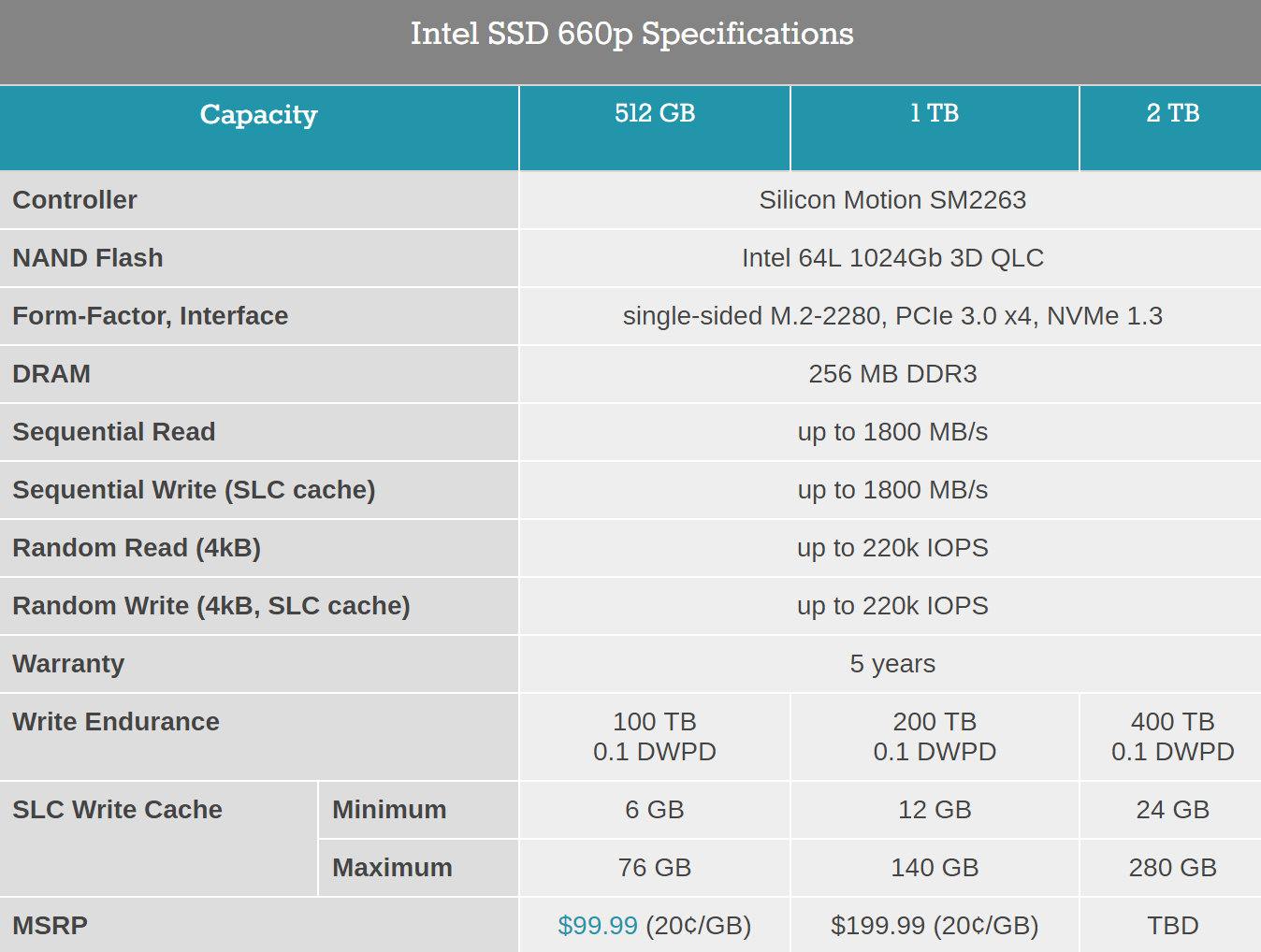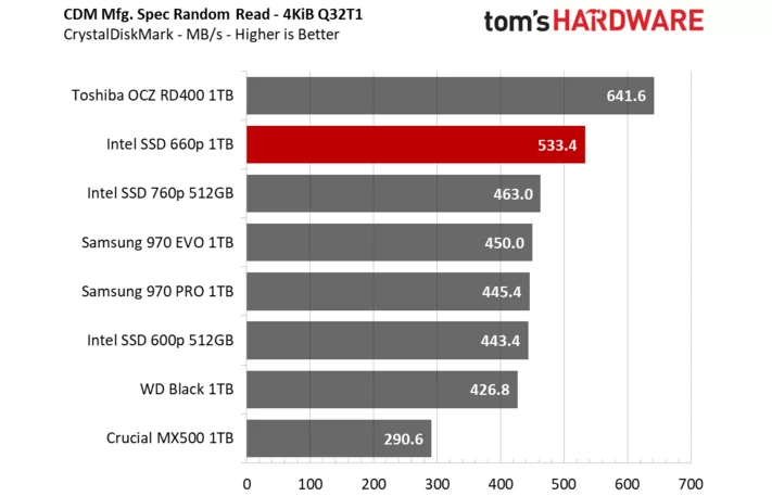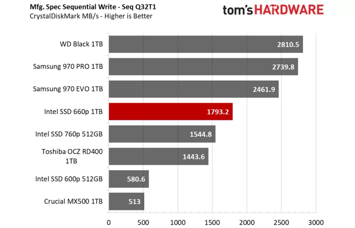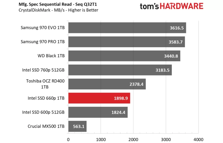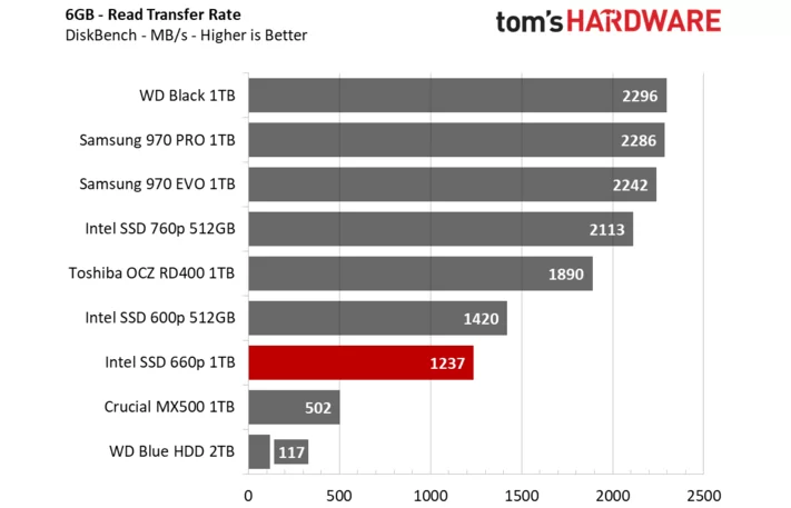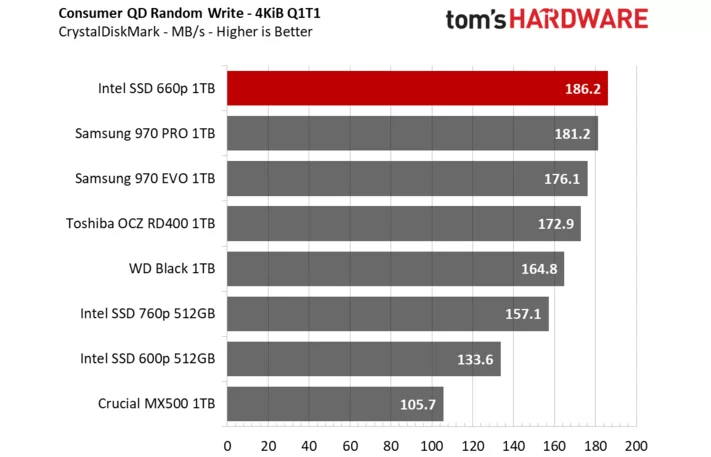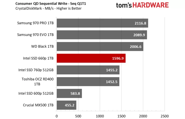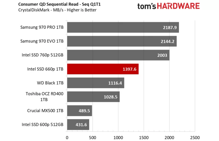 昨天三星才刚宣布量产消费级QLC SSD,今天Intel就正式解禁了第一款QLC SSD 660p的评测。作为机械硬盘潜在替代产品的QLC SSD,Intel 660p容量直接就从512GB起步,按照100美元的建议零售价,折算成人民币才680元,每GB价格才1.3元,实在是便宜。那么性能如何,下面我们将通过节选tomshardware的评测来解答一切。