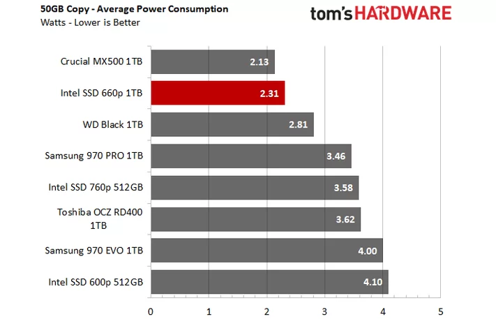 关于功耗方面,在复制测试中,功耗表现优异,只有2.31W,远低于自家的600P、顶级三星970 Pro。