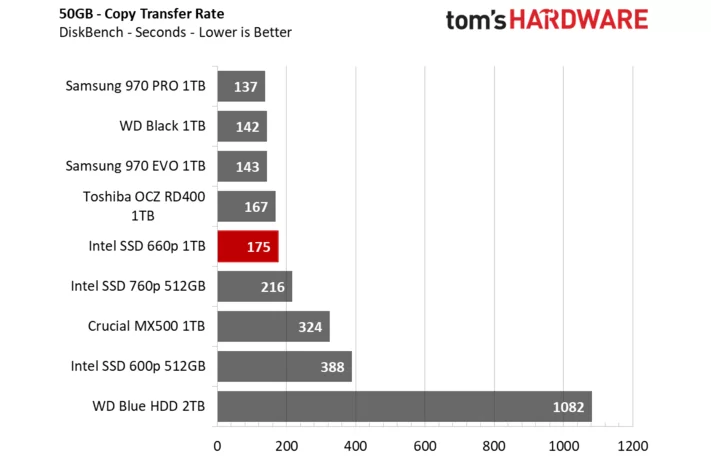 而在50GB的大文件复制测试中,Intel 660p只比最强的三星970 Pro少38秒,表现比之前的Intel 600P好多了。