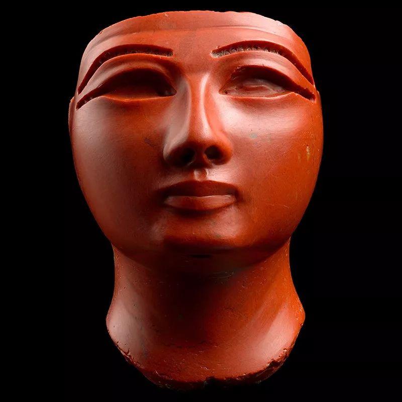尽管这一精致头像的上半部分已经缺失,但其仍可称得上是雕刻杰作。这件头像使用一整块单色红碧玉雕琢而成,根据头像的形状能够推断出它最初可能佩戴了一顶蓝色彩陶皇冠,这证实了头像的身份是皇室成员的形象。尽管已不可能对这一头像的时代进行精确鉴定,但它作为保存完好且极具艺术价值的古埃及前阿玛尔纳时期复合雕像,仍具有非常重要的意义。